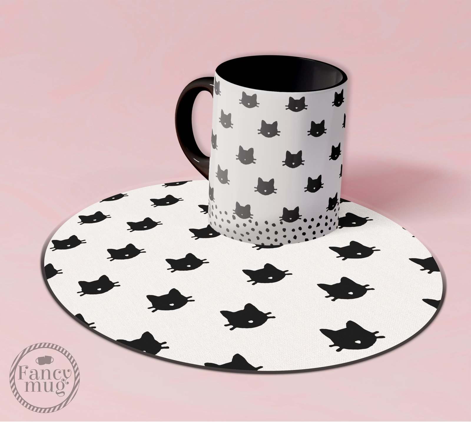 El diseño presenta pequeñas siluetas de gatos en negro sobre fondo blanco, creando un contraste limpio y elegante. El patrón repetido aporta dinamismo sin perder armonía visual, convirtiéndolo en un kit ideal tanto para oficina como para hogar.