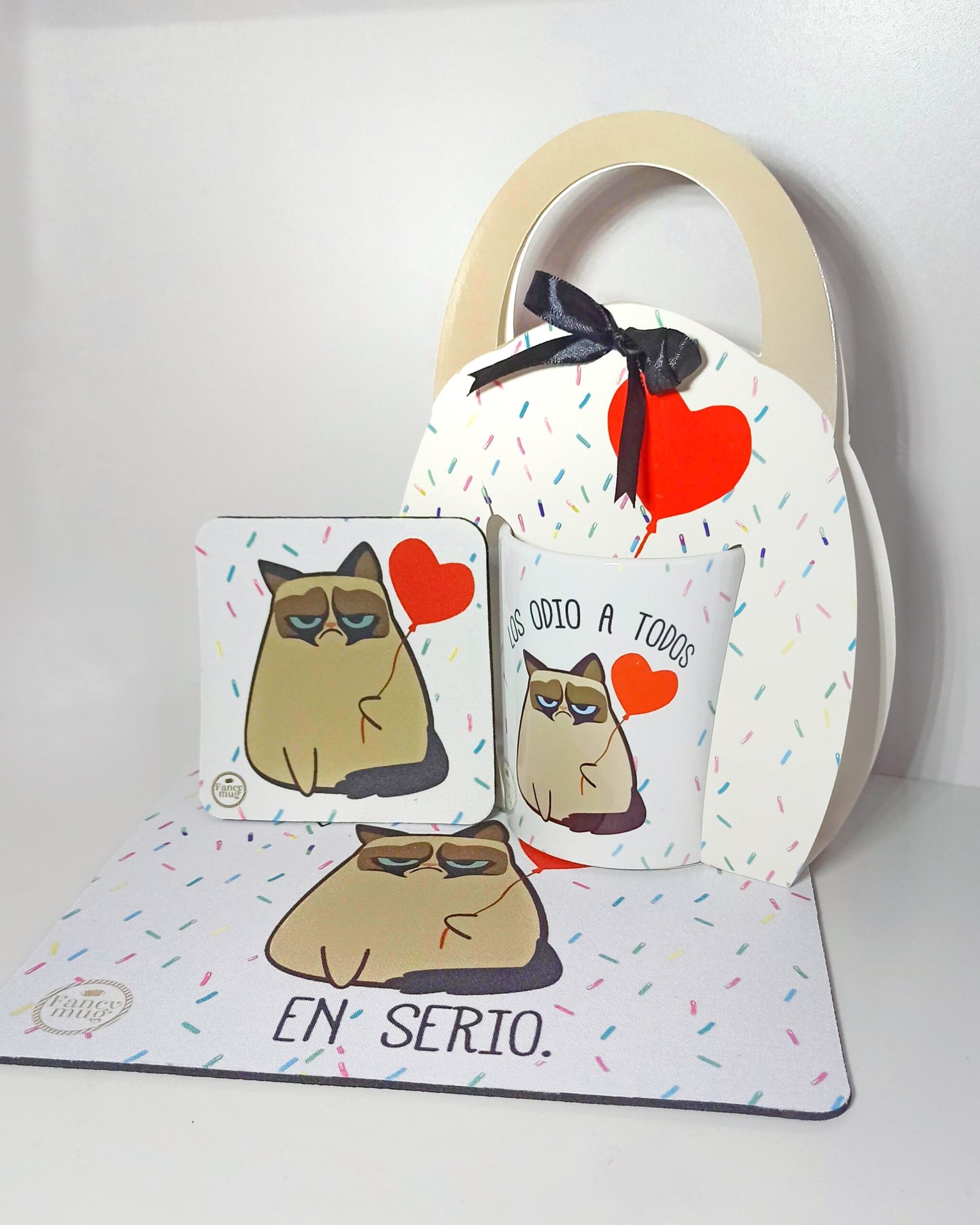 El protagonista es un gatito con expresión indiferente acompañado de corazones rojos y frases que dicen: