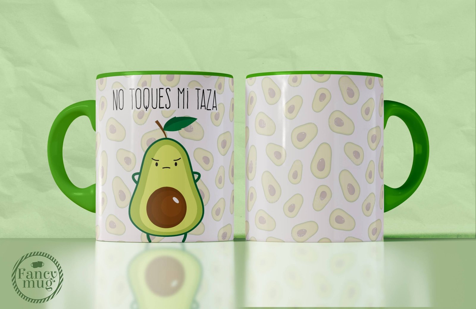 El diseño presenta un aguacate con expresión firme y divertida, acompañado de un patrón repetido que llena el conjunto de color y coherencia visual.