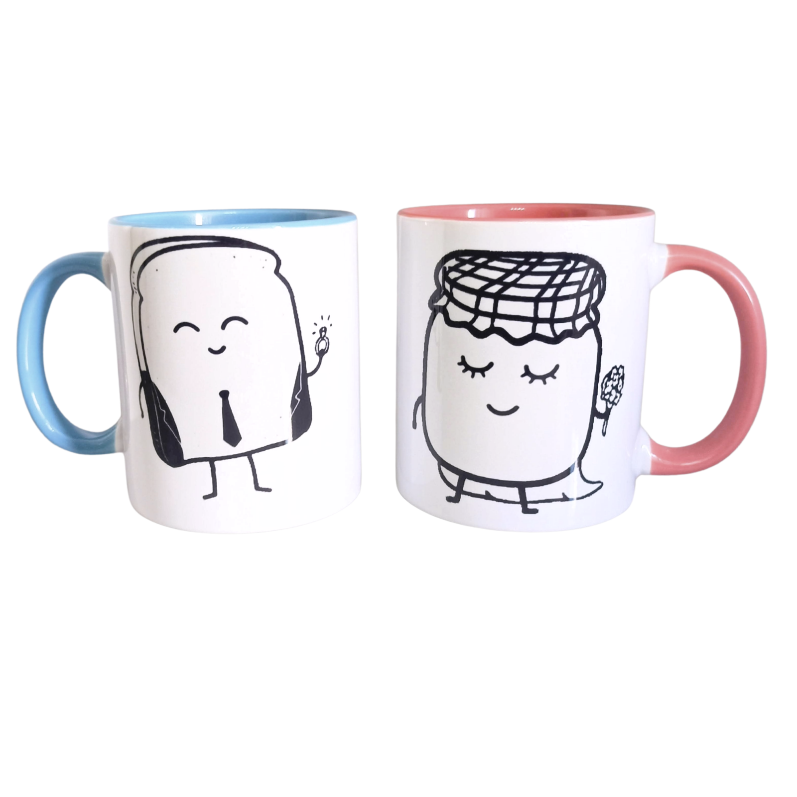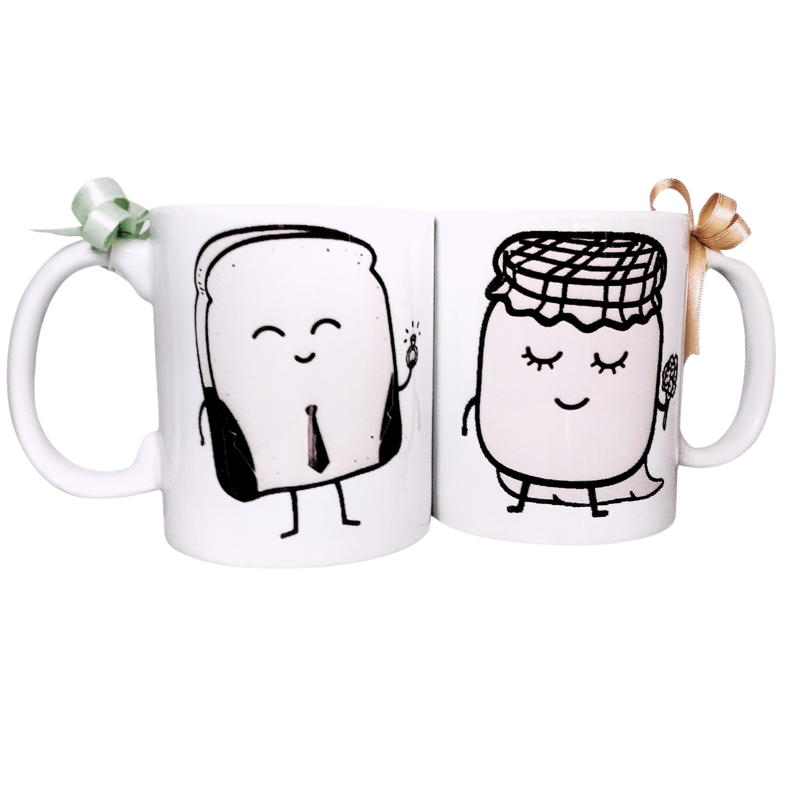 Set de dos tazas blancas con ilustraciones minimalistas de personajes adorables y frase complementaria “juntos es mejor”, ideal como regalo para pareja o amigos.Set Tazas | «Pan y Mermelada – Juntos es Mejor»