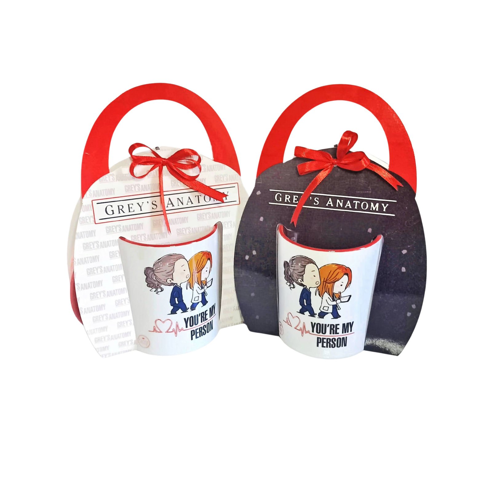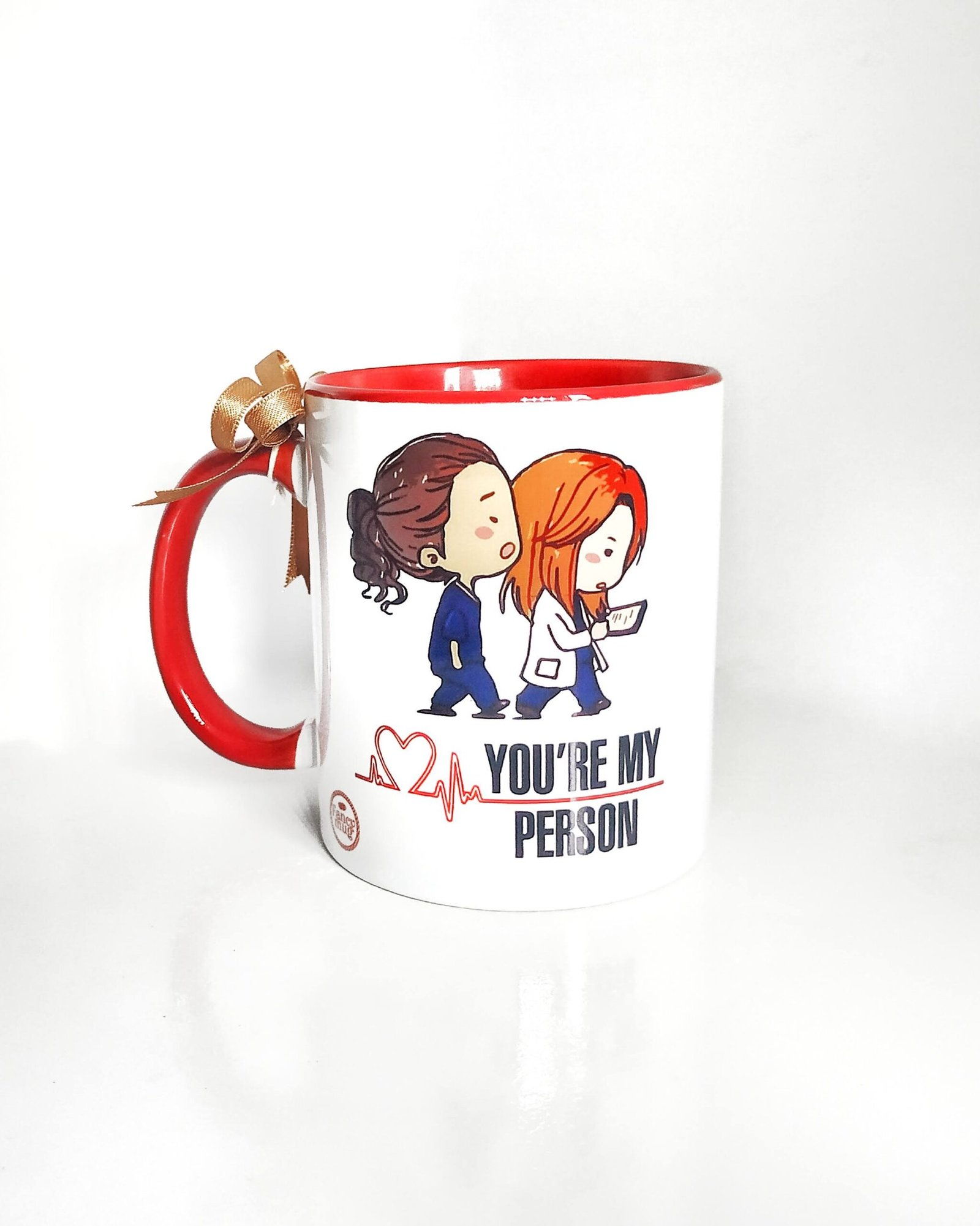 De un lado presenta la ilustración estilo caricatura de dos amigas caminando juntas, acompañadas de la frase “You’re My Person” con un delicado detalle de latido en rojo ❤️