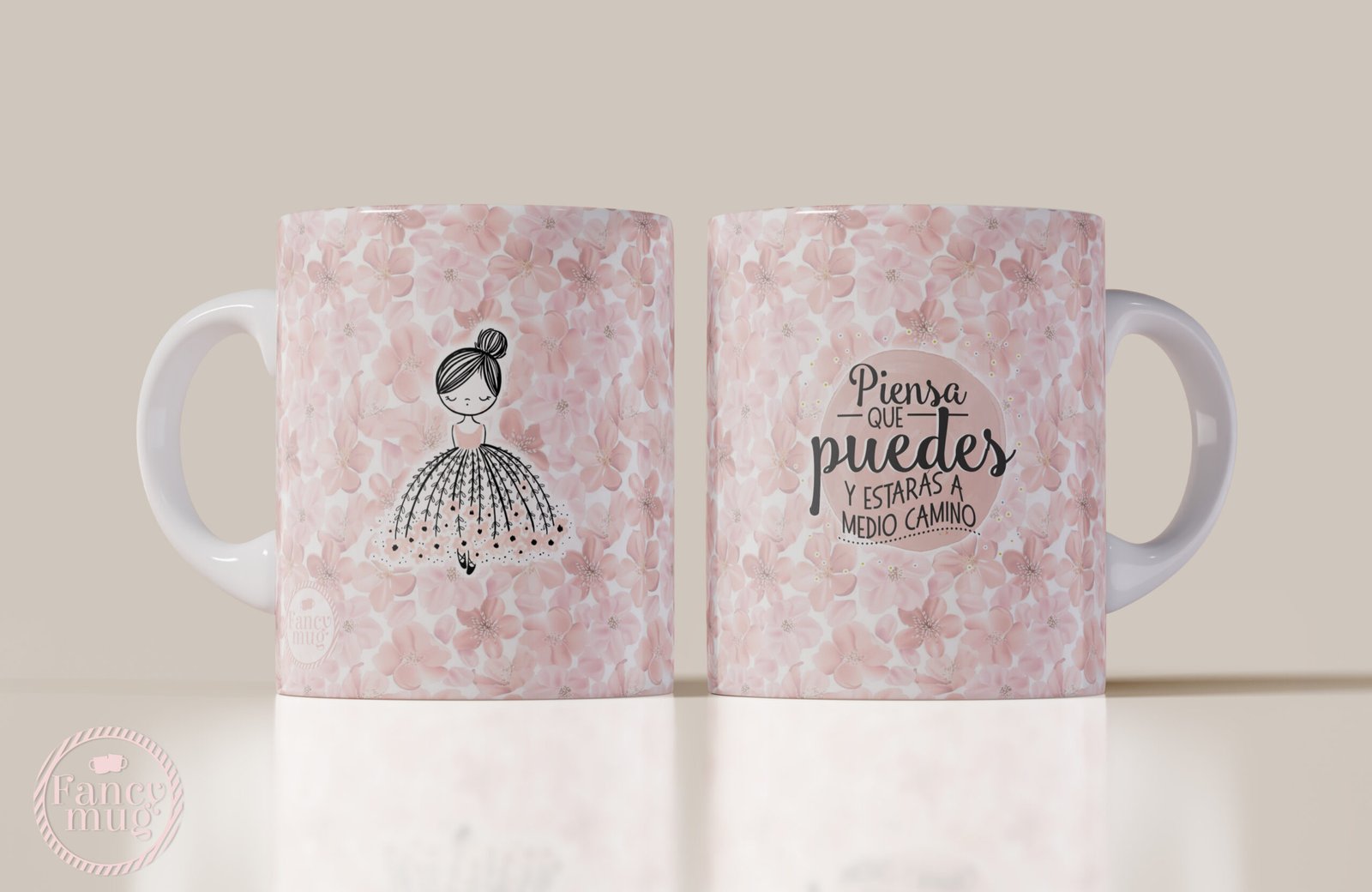 La Taza Balerina combina un fondo floral en tonos rosados suaves con una ilustración delicada que transmite gracia, sensibilidad y determinación.