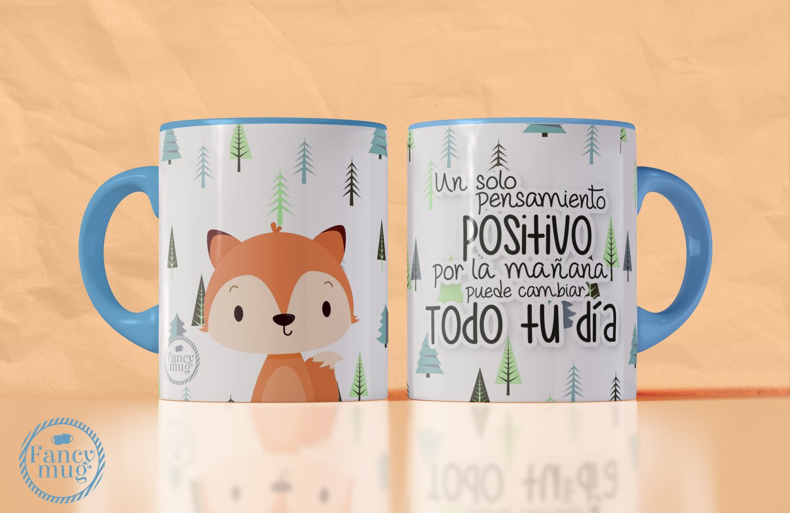 Taza blanca con asa celeste, ilustración de zorrito tierno y frase motivadora “Un pensamiento positivo puede cambiar tu día”Taza Zorrito | «Un pensamiento positivo puede cambiar tu día»